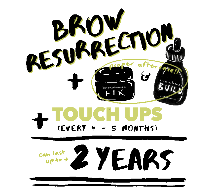 With proper post-treatment TLC and diligent usage of our after-care products, Brow Resurrection Define should last up to 1.5 years while the first session of Brow Resurrection Natural may last up to 3 months. Schedule in your first tune up to be done within 3 months and subsequent touch ups every 4 to 5 months, and Brow Resurrection Natural results can be prolonged for up 2 years.
